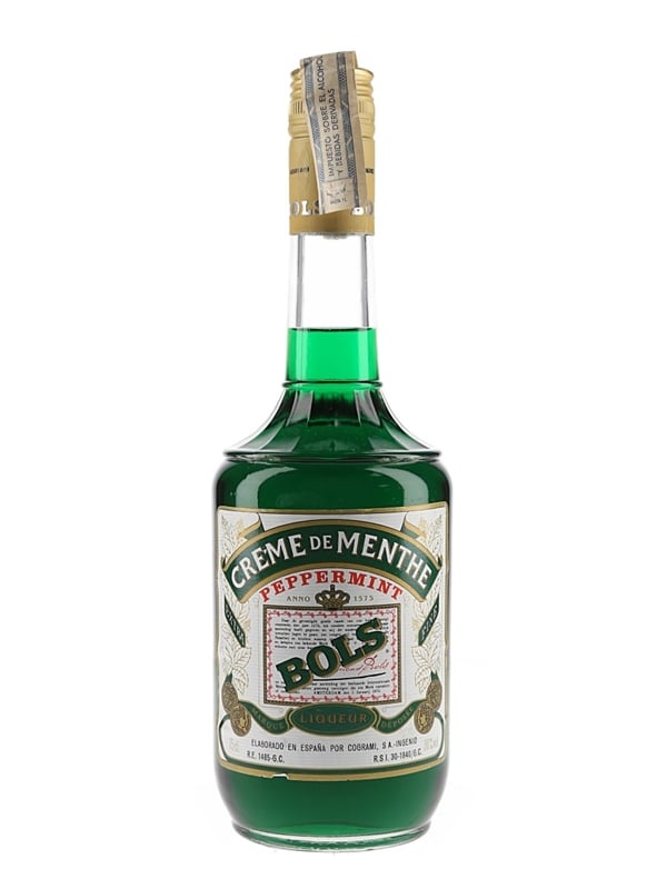 A bottle of Crème De Menthe Bols Peppermint liqueur bottled for the Spanish market.