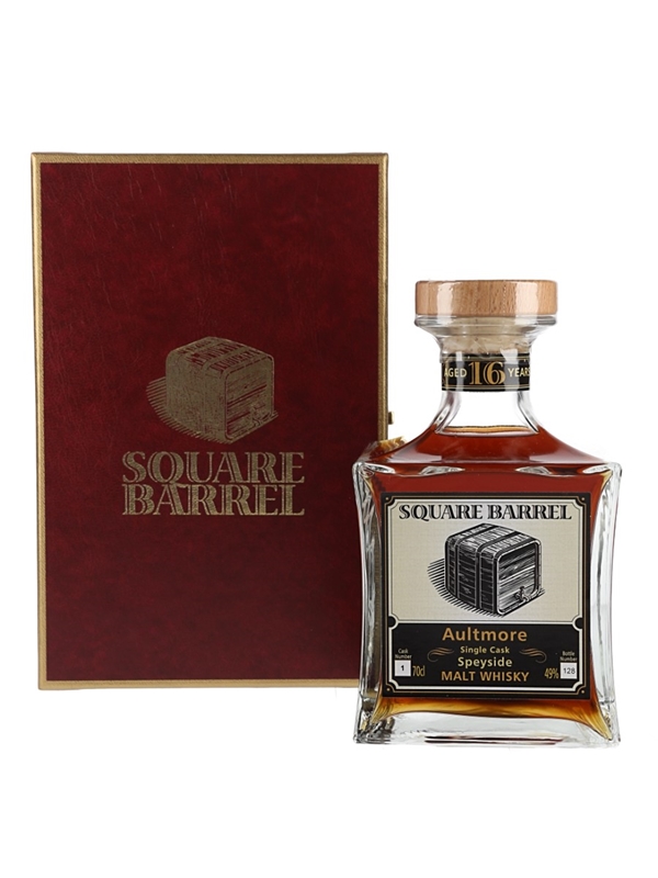 A bottle of Aultmore 16 Year Old Single Cask Speyside Single Malt Scotch whisky. This was matured in Square barrels.
