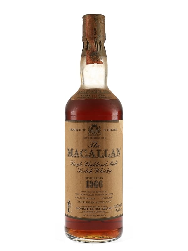 A bottle of The Macallan 18 Year Old Single Highland Malt Scotch Whisky, distilled in 1966 and matured in sherry casks. This was bottled for the Italian market and imported by Giovinetti, we estimate in the 1980s.