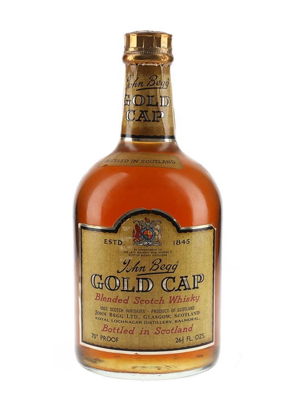 A bottle of John Begg Gold Cap Blended Scotch Whisky, produced by John Begg Ltd., Royal Lochnagar Distillery, Balmoral. We estimate this was bottled in the 1970s.