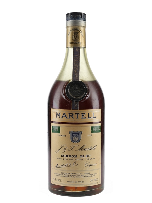 A bottle of Martell Cordon Bleu Fine Liqueur Cognac Brandy. We estimate this was bottled in the early 1970s.