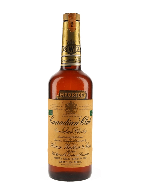 A bottle of Canadian Club, distilled and bottled by Hiram Walker & Sons. The Canadian tax strip reads 1967, this indicates that the youngest whisky in the bottle was distilled in 1967. We estimate this was bottled in the early 1970s.