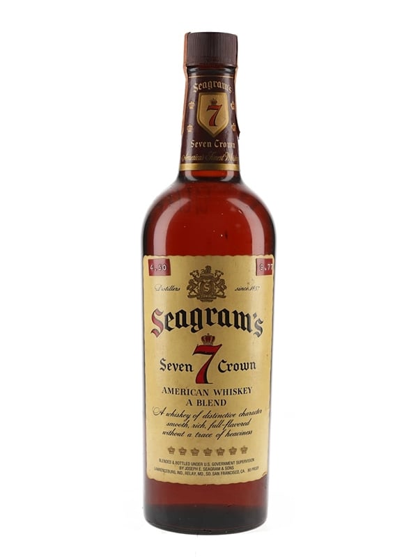 A bottle of Seagram's 7 Crown American blended whiskey. We estimate this was bottled in the 1970s.