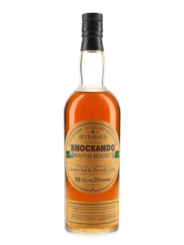 A bottle of Knockando 12 Year Old Single Malt Scotch Whisky. This was distilled in 1959 and bottled in 1972 by Justerini & Brooks.