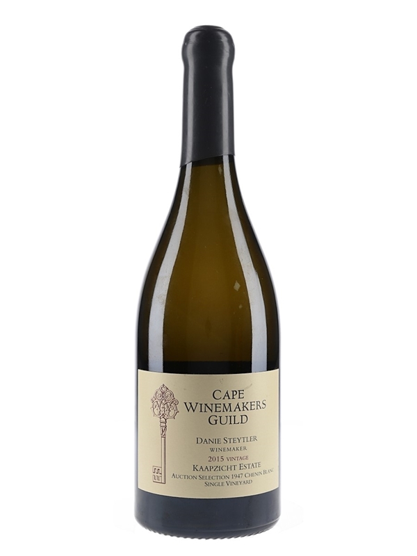 A bottle of Cape Winemakers Guild Chenin Blanc 2015 from Kaapzicht Estate in Stellenbosch, South Africa. This is the Auction Selection 1947 Single Vineyard bottling, harvested from the second oldest Chenin Blanc vineyard in the country, and only 900 bottles were produced.
