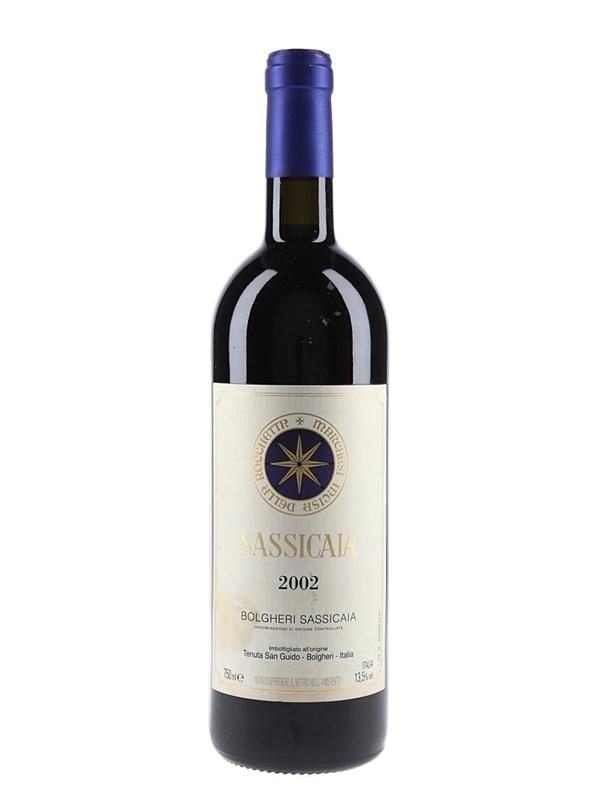 A bottle of Bolgheri Sassicaia 2002, bottled at Tenuta San Guido. This is a blend of 85% Cabernet Sauvignon and 15% Cabernet Franc.