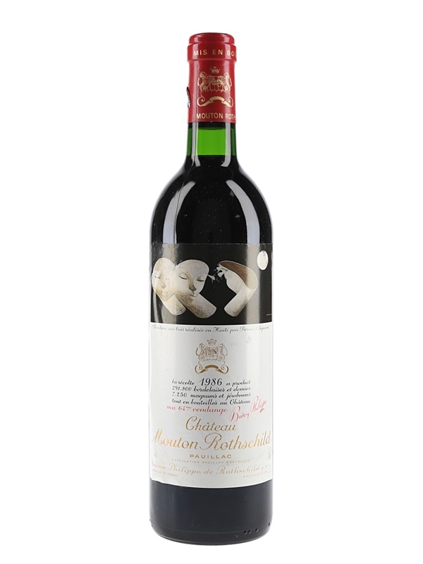 A bottle of Chateau Mouton Rothschild 1986 from Bordeaux's Pauillac appellation, a blend of 80% Cabernet Sauvignon, 10% Merlot, 8% Cabernet Franc and 2% Petit Verdot.
