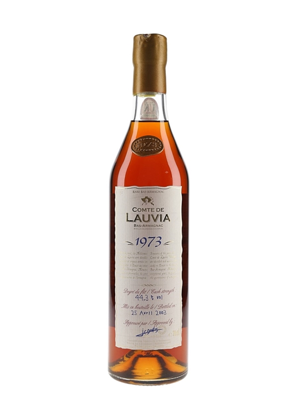 A bottle of Comte de Lauvia 1973 Bas Armagnac. This was matured in oak casks in Comte de Lauvia's La Cathédrale cellar and bottled at cask strength on 25 April 2003.