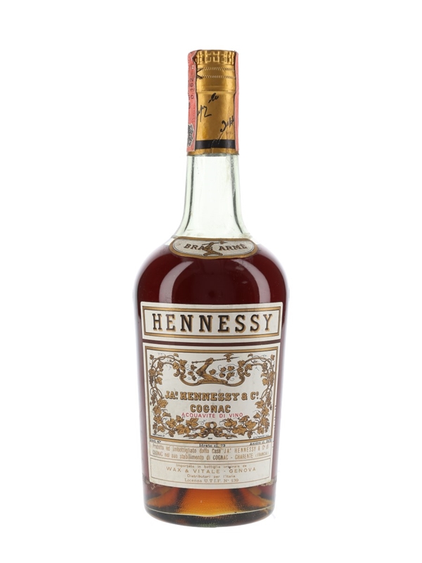 A bottle of Hennessy Bras Arme, named for its logo, the 'armed arm'. We estimate this was bottled in the 1960s to 1970s. This was imported to Italy by Wax & Vitale.