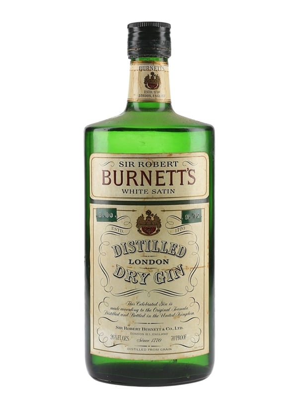 A bottle of Sir Robert Burnett's White Satin London Dry Gin. We estimate this was bottled in the 1970s.