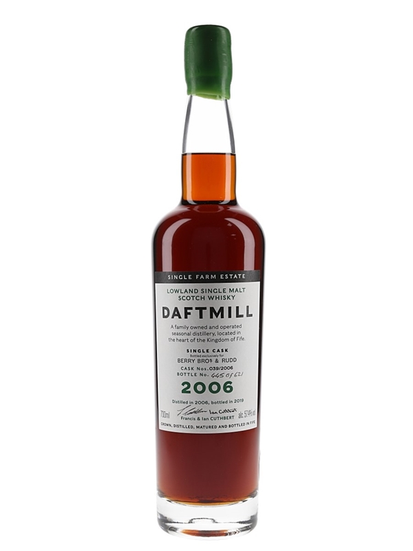 A bottle of Daftmill Single Cask Lowland Single Malt Scotch Whisky distilled in 2006 and bottled in 2019 at a cask strength of 57.4% ABV exclusively for Berry Bros & Rudd.