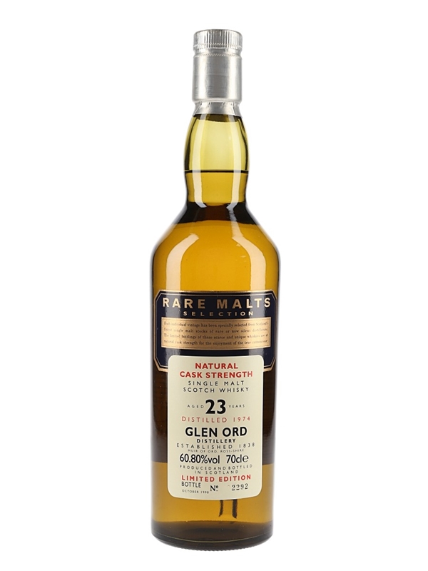 A bottle of Glen Ord 23 Year Old, distilled in 1974 and bottled in October 1998 for the Rare Malts Selection.