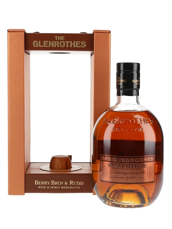 A bottle of Glenrothes Oldest Reserve Speyside Single Malt Scotch Whisky produced by Berry Bros and Rudd Wine & Spirit Merchants.