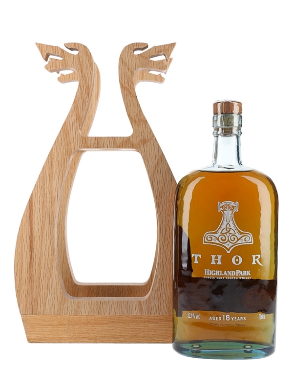 A bottle of Highland Park Thor 16 Year Old Single Malt Scotch Whisky. This is the first release in Highland Park's Valhalla Collection: Thor, God of Thunder and alleged architect of the Cliffs of Yesnaby on the west coast of Orkney Mainland.