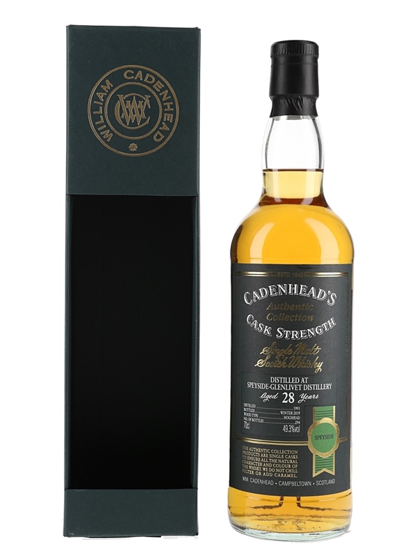 A bottle of Speyside-Glenlivet 28 Year Old Single Malt Scotch Whisky. This was distilled in 1991, matured in a hogshead and bottled at cask strength in winter 2019 by Cadenhead's as a part of the Authentic Collection.