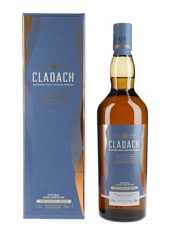 A bottle of Cladach Blended Malt Scotch Whisky. This is a blend of single malts from coastal distilleries: Inchgower, Clynelish, Talisker, Oban, Caol Ila and Lagavulin. It was bottled at natural cask strength in 2018 for Diageo's Special Releases series.