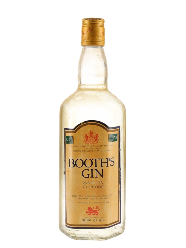 A bottle of Booth's Gin. We estimate this was bottled in the 1970s.The label carries a royal warrant by appointment to Her Majesty the Queen.