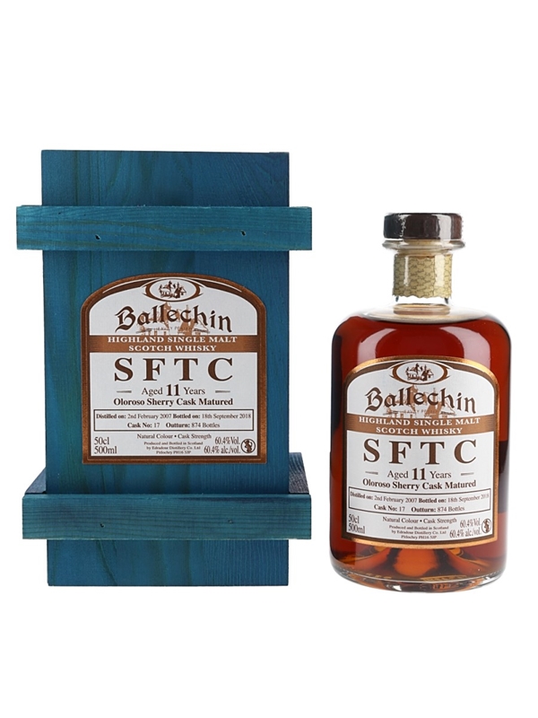A 50cl bottle of Ballechin 11 Year Old SFTC Highland Single Malt Scotch Whisky. This was distilled on 2 February 2007, matured for 11 years in an oloroso sherry cask and bottled at a cask strength of 60.4% ABV on 18 September 2018 by Edradour Distillery Co. Ltd.