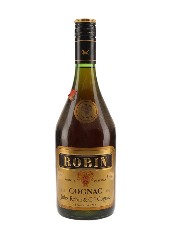 A bottle of Robin 3 Star Cognac produced in France by Jules Robin & Cie. We estimate this was bottled in the 1980s.