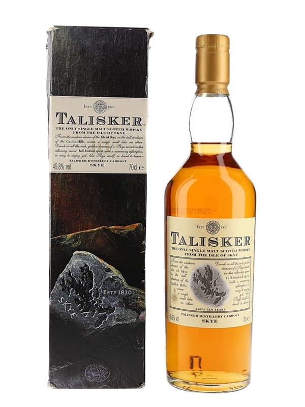 A bottle of Talisker 10 Year Old Single Malt Scotch Whisky from the Isle of Skye, part of Diageo's Classic Malts of Scotland range. We estimate this was bottled in the early 2000s.
