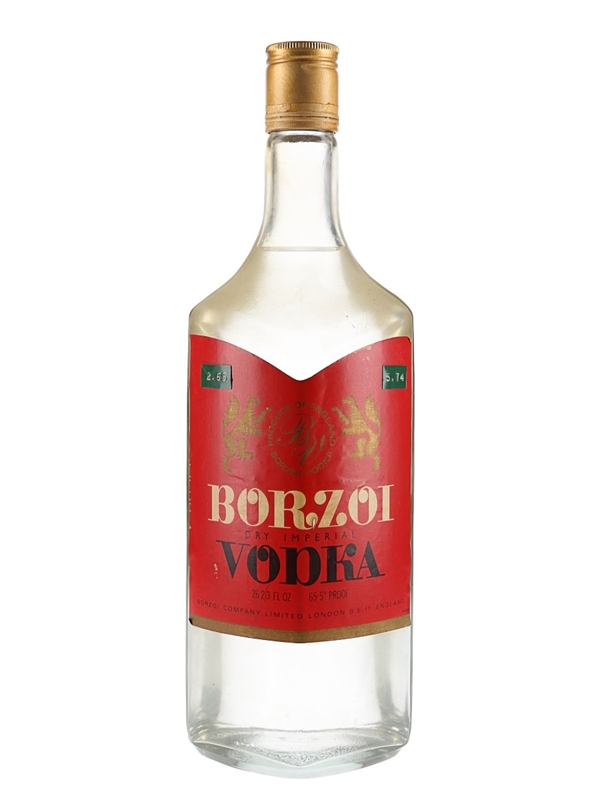 A bottle of Borzoi Dry Imperial Vodka produced and bottled in England. We estimate this was bottled in the 1970s.