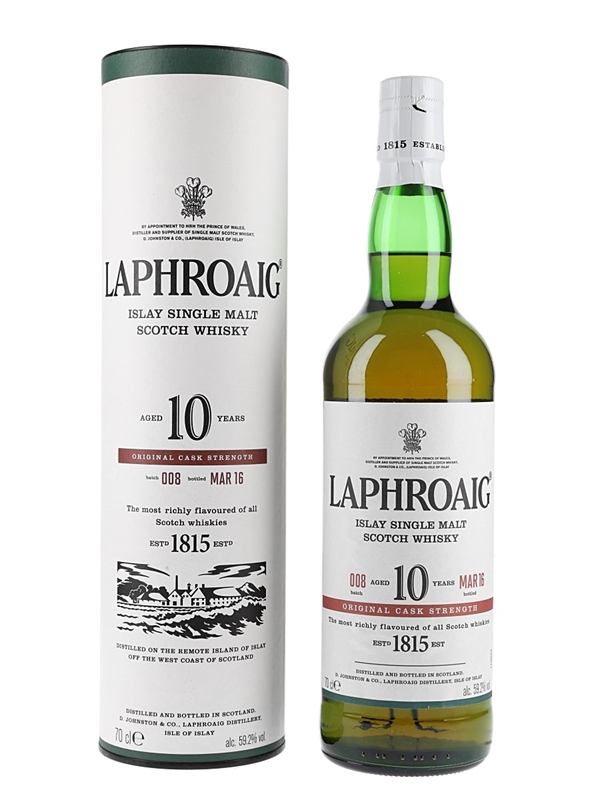 A bottle of Laphroaig 10 Year Old Original Cask Strength Islay Single Malt Scotch Whisky produced by D. Johnston & Co. and bottled at 59.2% ABV in March 2016.