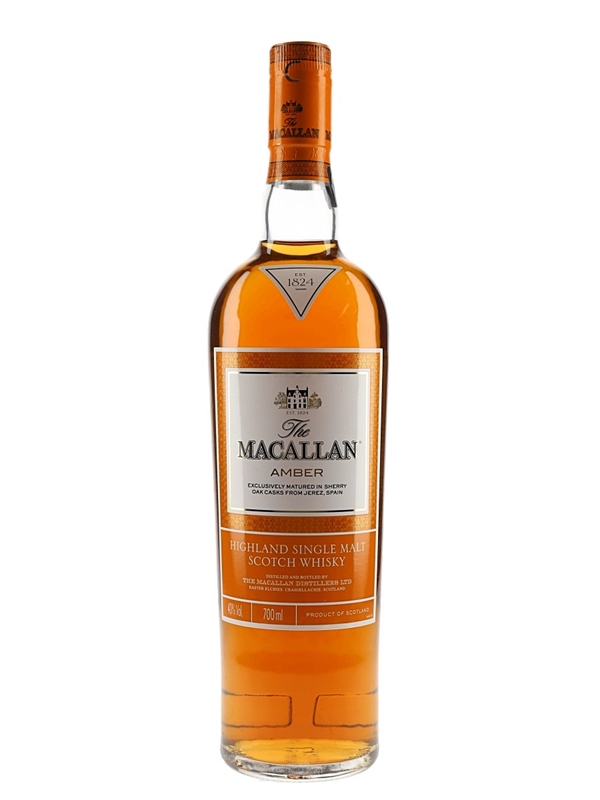 A bottle of The Macallan Amber Highland Single Malt Scotch Whisky, matured in sherry casks from Jerez, Spain. The 1824 Series is a range of Macallans released for the travel retail market.