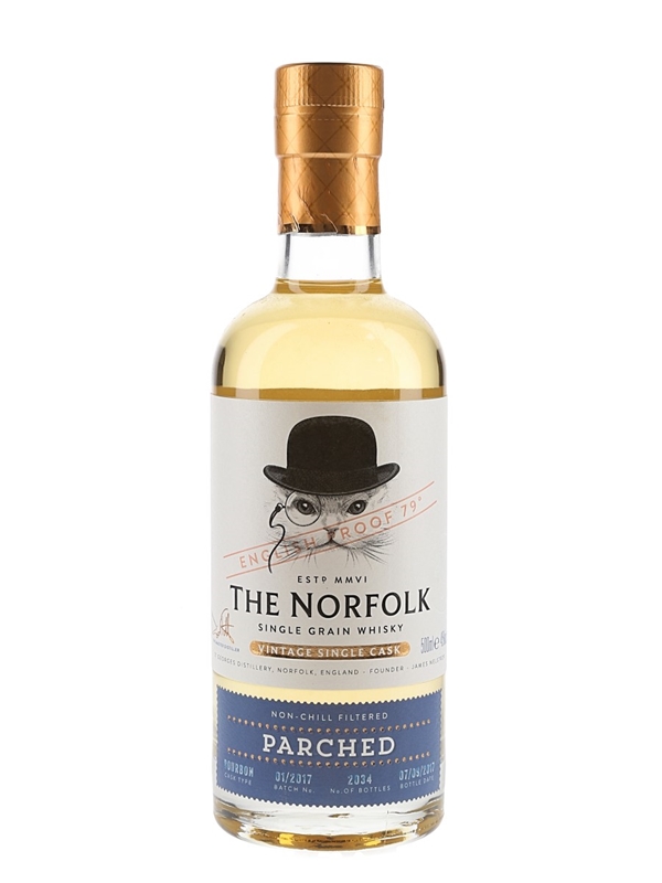 A 50cl bottle of The Norfolk Parched Vintage Single Cask Single Grain Whisky, matured in a bourbon cask and bottled at 45% ABV on 7 September 2017.