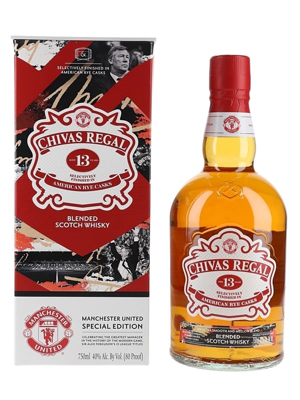 A bottle of Chivas Regal 13 Year Old Manchester United Special Edition Blended Scotch Whisky, selectively finished in American rye casks and bottled on 26 October 2019. This special edition commemorates former Manchester United manager Sir Alex Ferguson's 13 league titles. This was released as a sample bottle.