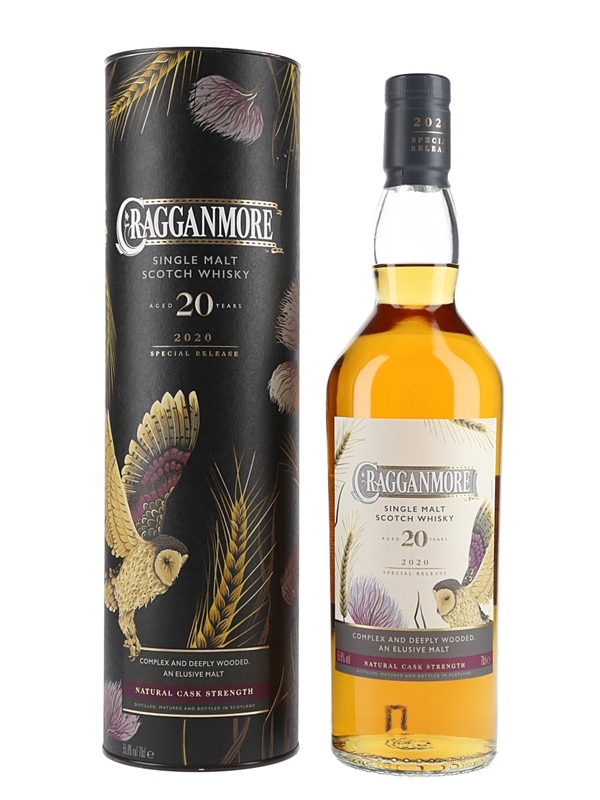 A bottle of Cragganmore 20 Year Old Single Malt Scotch Whisky, released in 2020 for Diageo's annual Special Releases series and bottled at a natural cask strength of 55.8% ABV.