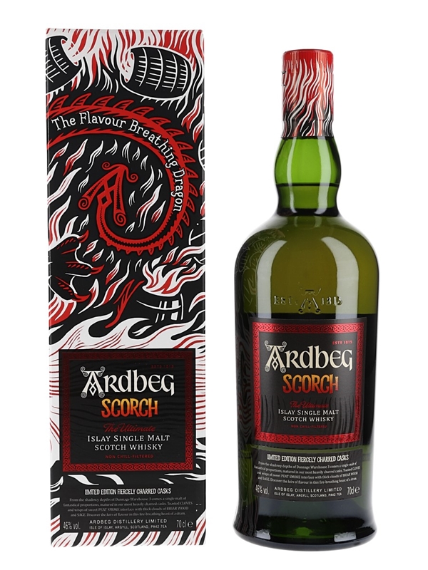 A bottle of Ardbeg Scorch The Ultimate Islay Single Malt Scotch Whisky, a limited edition matured in heavily charred ex-bourbon barrels and inspired by the Flavour Breathing Dragon which is said to live in the distillery's Dunnage Warehouse No.3. The bottle code indicates this was bottled on 16 February 2021.