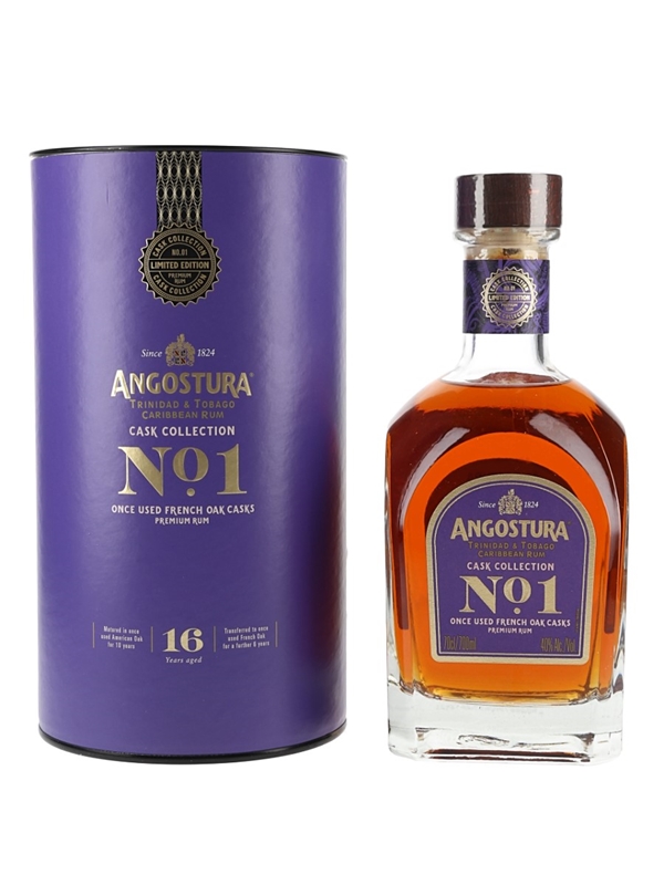 A bottle of Angostura Cask Collection No.1 Trinidad & Tobago Caribbean Rum, bottled and distributed in the UK by Burn Stewart Distillers. This was matured in American oak casks for 10 years and then transferred to French oak casks for a further six years.