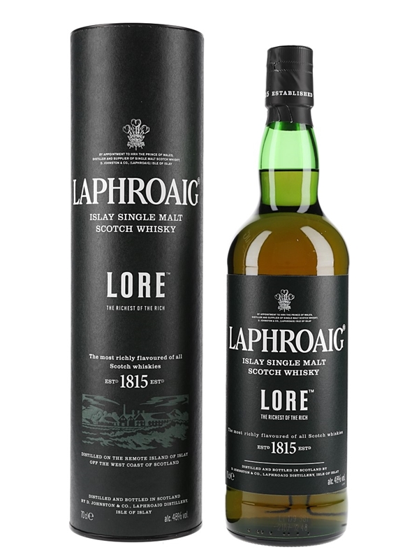 A bottle of Laphroaig Lore Islay Single Malt Scotch Whisky distilled and bottled by D. Johnston & Co. This was matured in quarter casks and first-fill sherry casks.