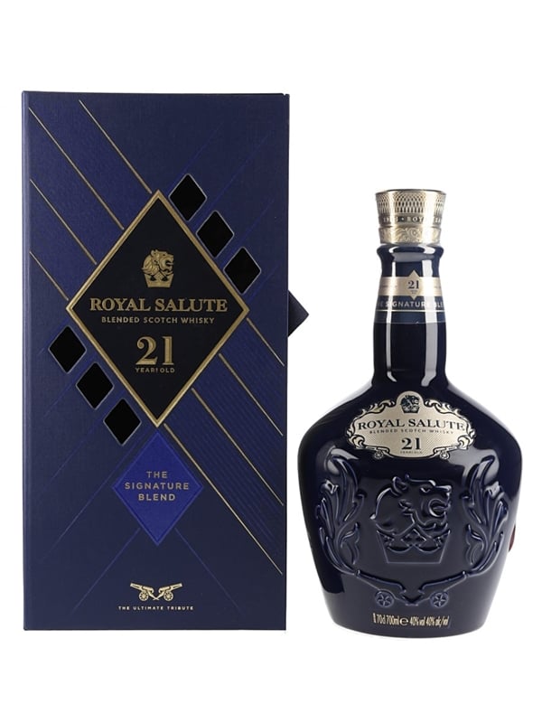A bottle of Chivas Brothers' Royal Salute 21 Year Old Blended Scotch Whisky, The Signature Blend, presented in a blue wade porcelain decanter.