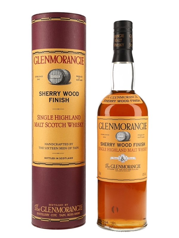 A bottle of the now discontinued Glenmorangie Sherry Wood Finish Single Highland Malt Whisky. The bottling code indicates this was bottled in 1996.