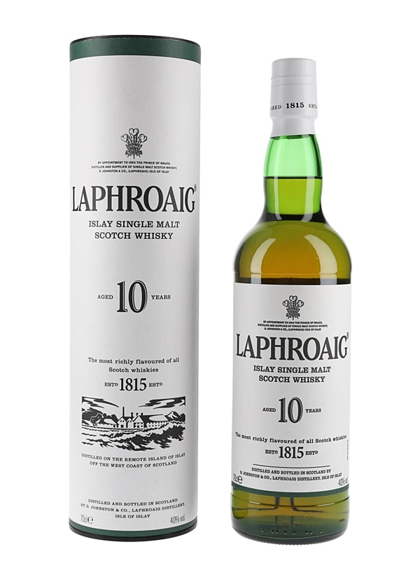 A bottle of Laphroaig 10 Year Old Islay Single Malt Scotch Whisky, produced by D. Johnston & Co.