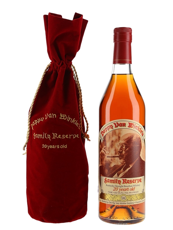 A bottle of Pappy Van Winkle's 20 Year Old Family Reserve Kentucky Straight Bourbon Whiskey, bottled by Old Rip Van Winkle Distillery, Frankfort. This was imported to England by Hi-Spirits. The bottling code indicates indicates it was bottled 2019.