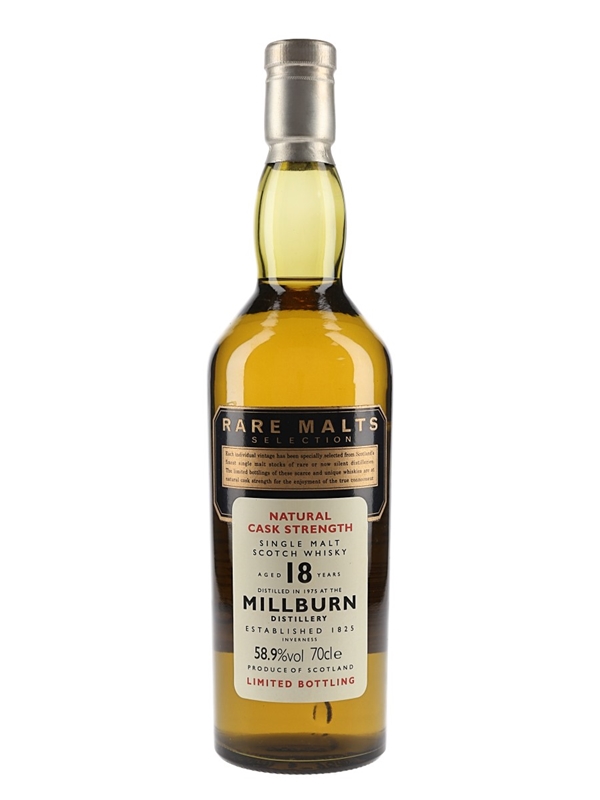 A bottle of Millburn 18 Year Old Single Malt Scotch Whisky. This was distilled in 1975 and bottled for Diageo's now discontinued Rare Malts Selection.