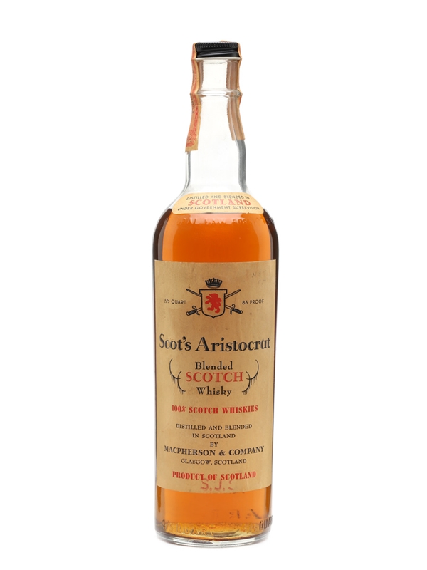 A bottle of Scot's Aristocrat Blended Scotch Whisky. Distilled and blended by Macpherson & Company.