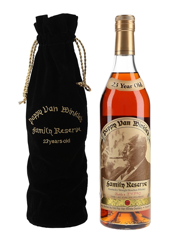 A bottle of Pappy Van Winkle's 23 Year Old Family Reserve Kentucky Straight Bourbon Whiskey, bottled by Old Rip Van Winkle Distillery, Frankfort. This was imported to England by Hi-Spirits Ltd.