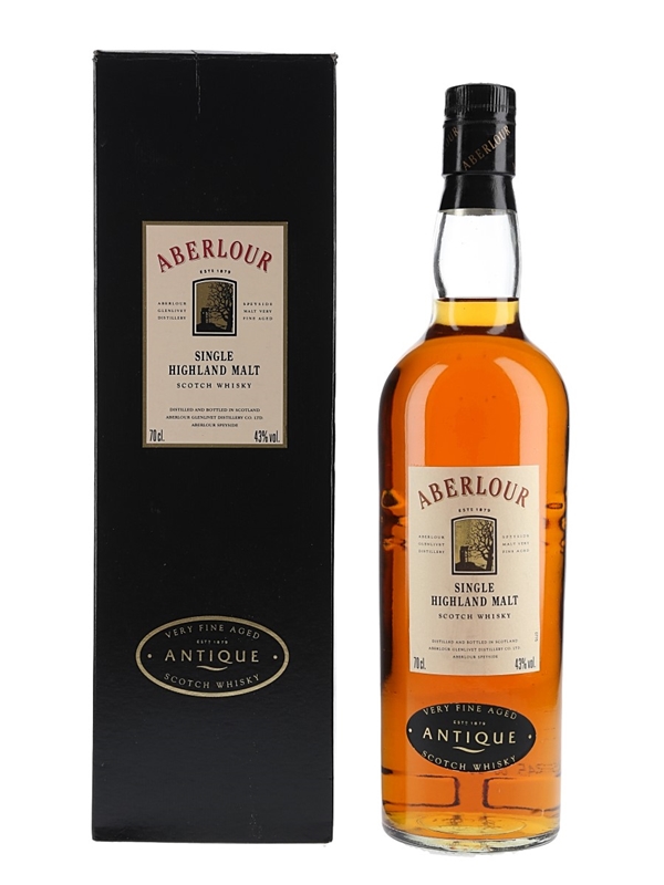 A bottle of Aberlour Antique Single Highland Malt Scotch Whisky, a duty free exclusive released at the turn of the millennium. This is a blend of malts aged between 10 and 25 years. We estimate this was bottled in the late 1990s to early 2000s.