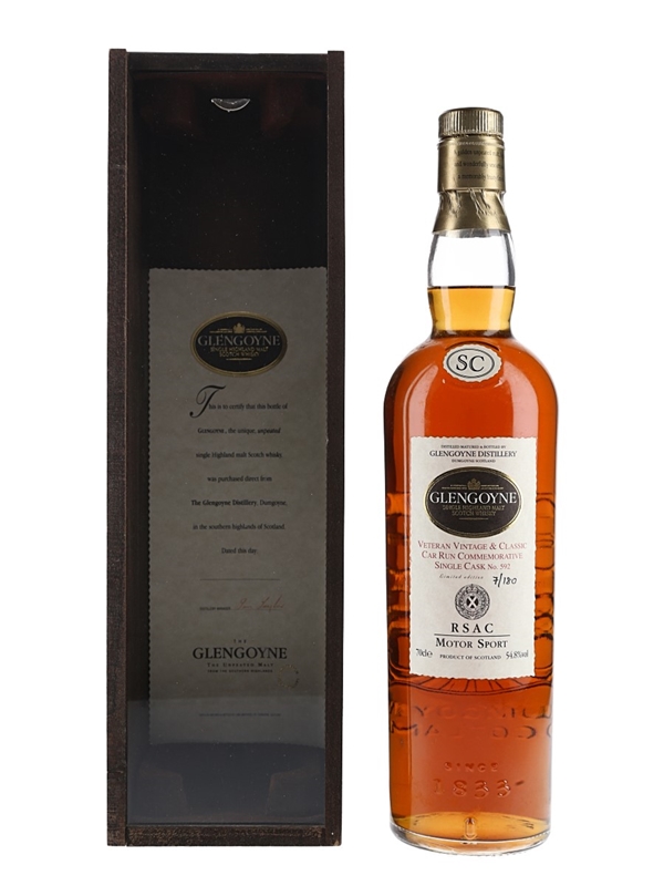 A bottle of Glengoyne RSAC Motor Sport Highland Single Malt Scotch Whisky, matured in a single cask number 592 for the Veteran Vintage & Classic Car Run. This is bottle number 7 of 180.