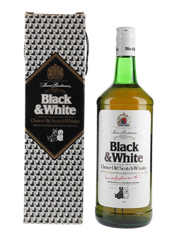 A litre bottle of Black & White Special Blend of Buchanan's Choice Old Scotch Whisky. We estimate this was bottled in the 1990s.