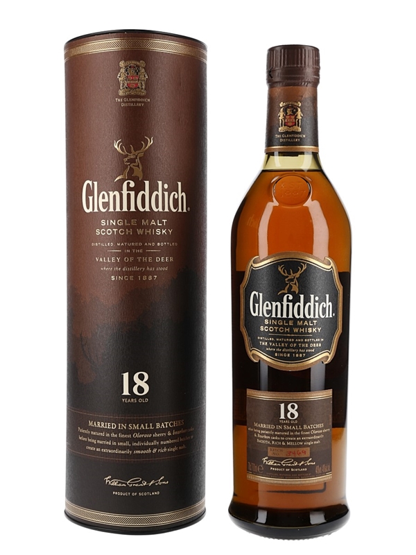 A bottle of Glenfiddich 18 Year Old Single Malt Scotch Whisky, matured in oloroso sherry and bourbon casks and married in small batches.