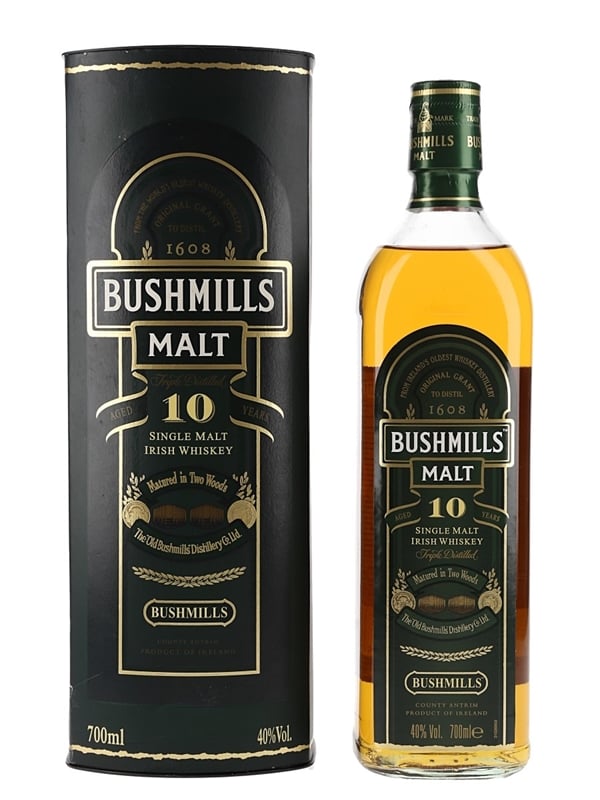 A bottle of Bushmills 10 Year Old Triple Distilled Single Malt Irish Whiskey.