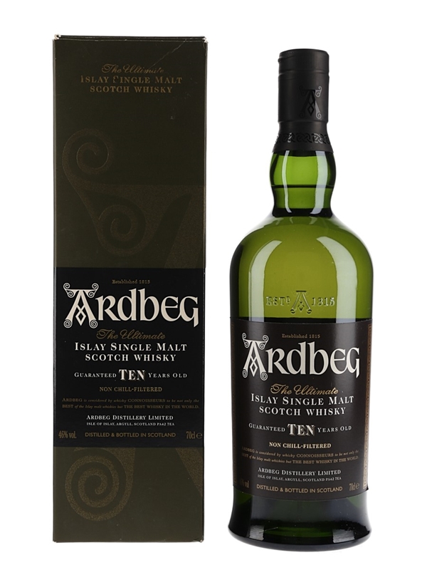 A bottle of Ardbeg 10 Year Old Single Islay Malt Scotch Whisky.