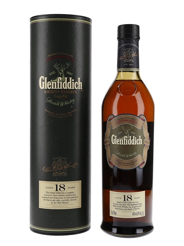 A bottle of Glenfiddich 18 Year Old Ancient Reserve Rare Old Pure Single Malt Scotch Whisky.