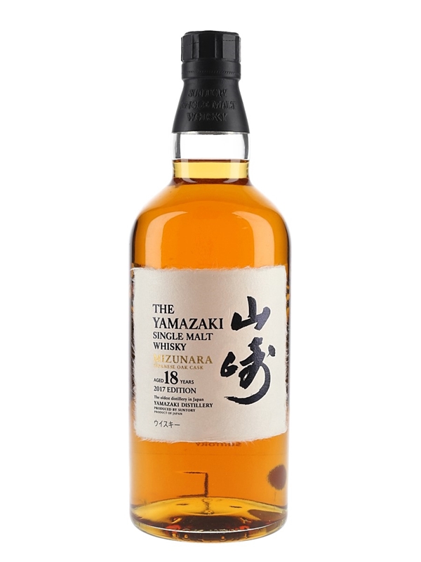 A bottle of The Yamazaki 18 Year Old Mizunara Oak, released in 2017. This is a blend of 18 to 50 year old whiskies selected by master blender Shinji Fukuyo.