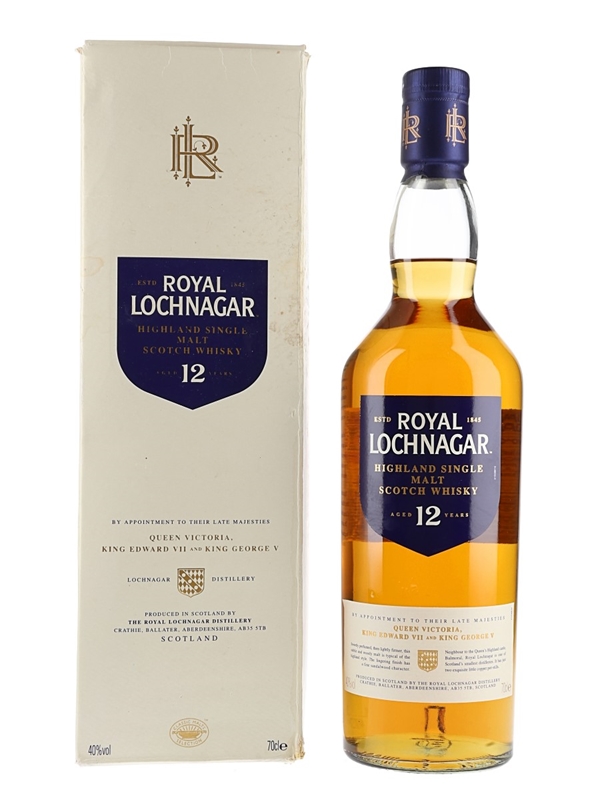 A bottle of Royal Lochnagar 12 Year Old Highland Single Malt Scotch Whisky, presented in a box.