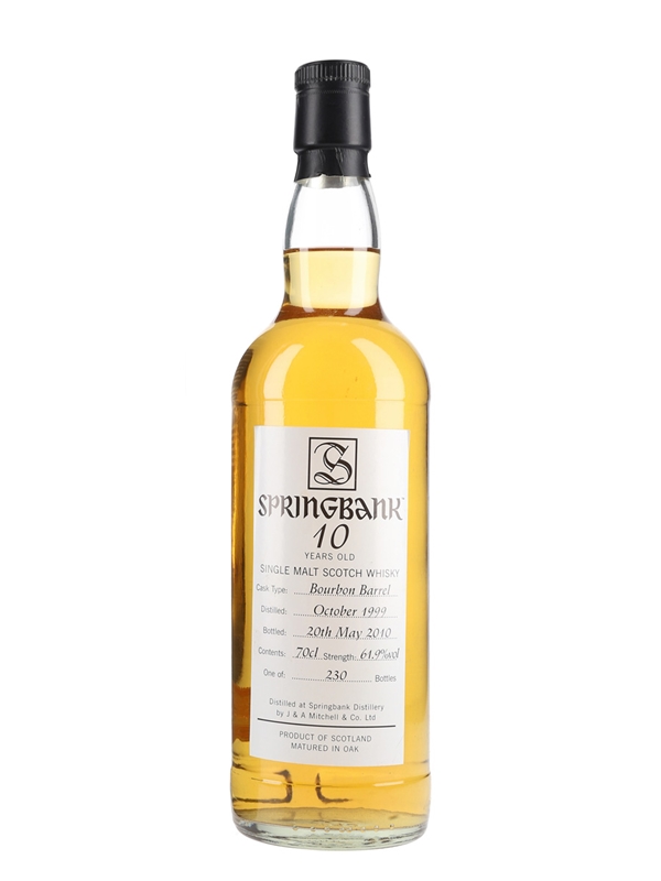A bottle of Springbank 10 Year Old Single Malt Scotch Whisky produced by J & A Mitchell & Co. Ltd. This was distilled in October 1999, matured for 10 years in a bourbon barrel and bottled on 20 May 2010 at a cask strength of 61.9% ABV.